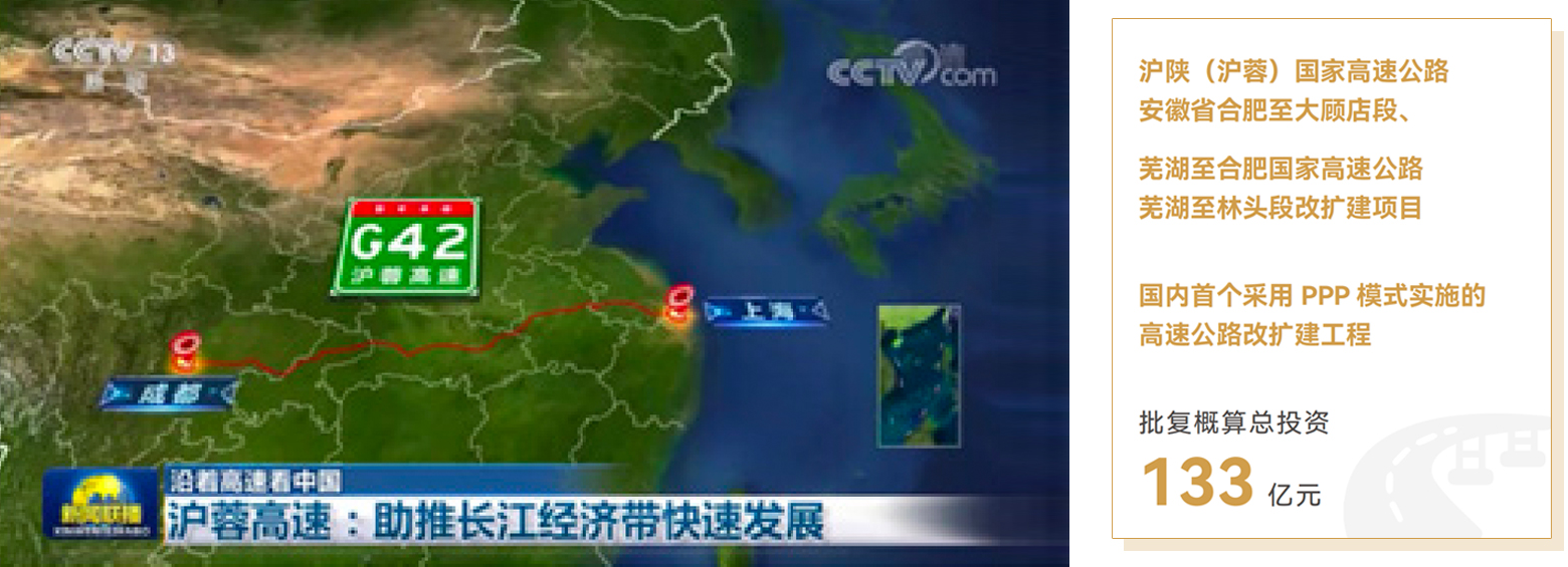 2019 年,公司承担了国内首个采用 PPP 模式实施的高速公路改扩建工程——沪陕(沪蓉)国家高速公路安徽省合肥至大顾店段、芜湖至合肥国家高速公路芜湖至林头段改扩建项目。改扩建项目总里程约 144.47 公里,批复概算总投资132.51 亿元。公司积极探索交通项目投融资新机制、新模式,针对存量既有项目运营与改扩建新增部分的建设运营、原运营单位与新项目公司之间的权利义务和利益分配、改扩建后收费期限延长等难题,首创提出将既有部分和改扩建新增部分分别独立实施的方案。既有部分仍由原运营单位继续收费经营,新项目公司负责改扩建新增部分的建设及收费经营。本项目是采用 ROT 模式运作的首个高速公路 PPP 项目,既顺利获得了国家车购税补助资金支持,又在现行法律法规框架体系下快速推进了既有项目收费权和资产的交易,对全国高速公路改扩建项目具有极强的借鉴和参考意义。