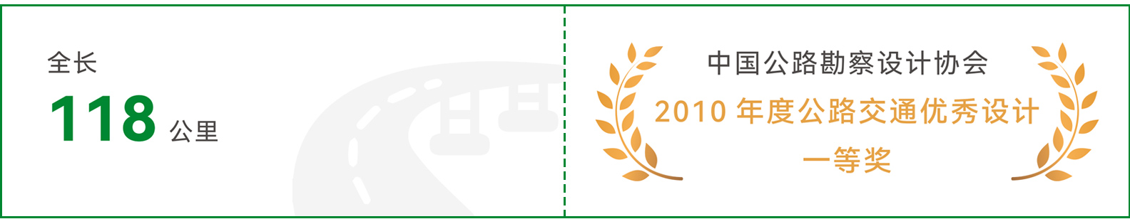 该项目全长 118.4 公里,地处丘陵山地,地势起伏较大,河网密布,是平衡发展与自然的高难度工程。公司勘察设计团队采用新技术新设备,结合实地勘察,选取了一条适合困难山区地形地域特征,同时有利于沿线土地开发及经济可持续发展的路线方案,合理地进行了支挡防护工程、桥隧工程、排水工程、三改工程的设计,实现了方案合理、结构安全、造价节约、景观和谐的设计目标。施工过程中,公司技术骨干成立的设计代表组长期驻守施工现场,及时解决和指导施工过程中遇到的技术问题;配合业主对重点、难点工程进行技术研讨,使得工程顺利竣工。该项目荣获 2010 年度中国公路勘察设计协会公路交通优秀设计一等奖。