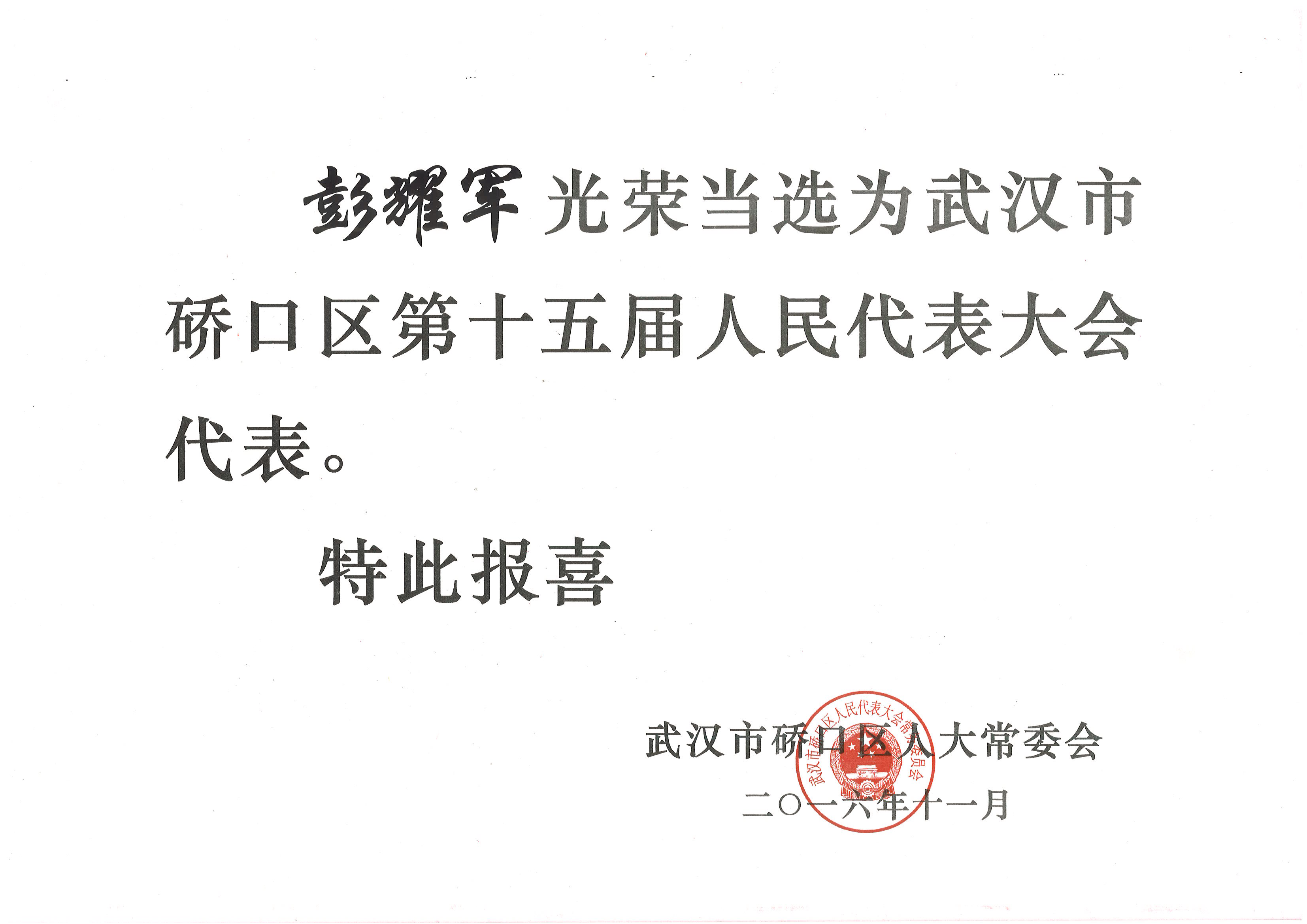 2016年12月1日,一纸大红喜报传来喜讯:中交公路规划设计院有限公司武汉办事处主任、华杰工程咨询有限公司中南分公司总经理彭耀军光荣当选武汉市硚口区第十五届人民代表大会代表。