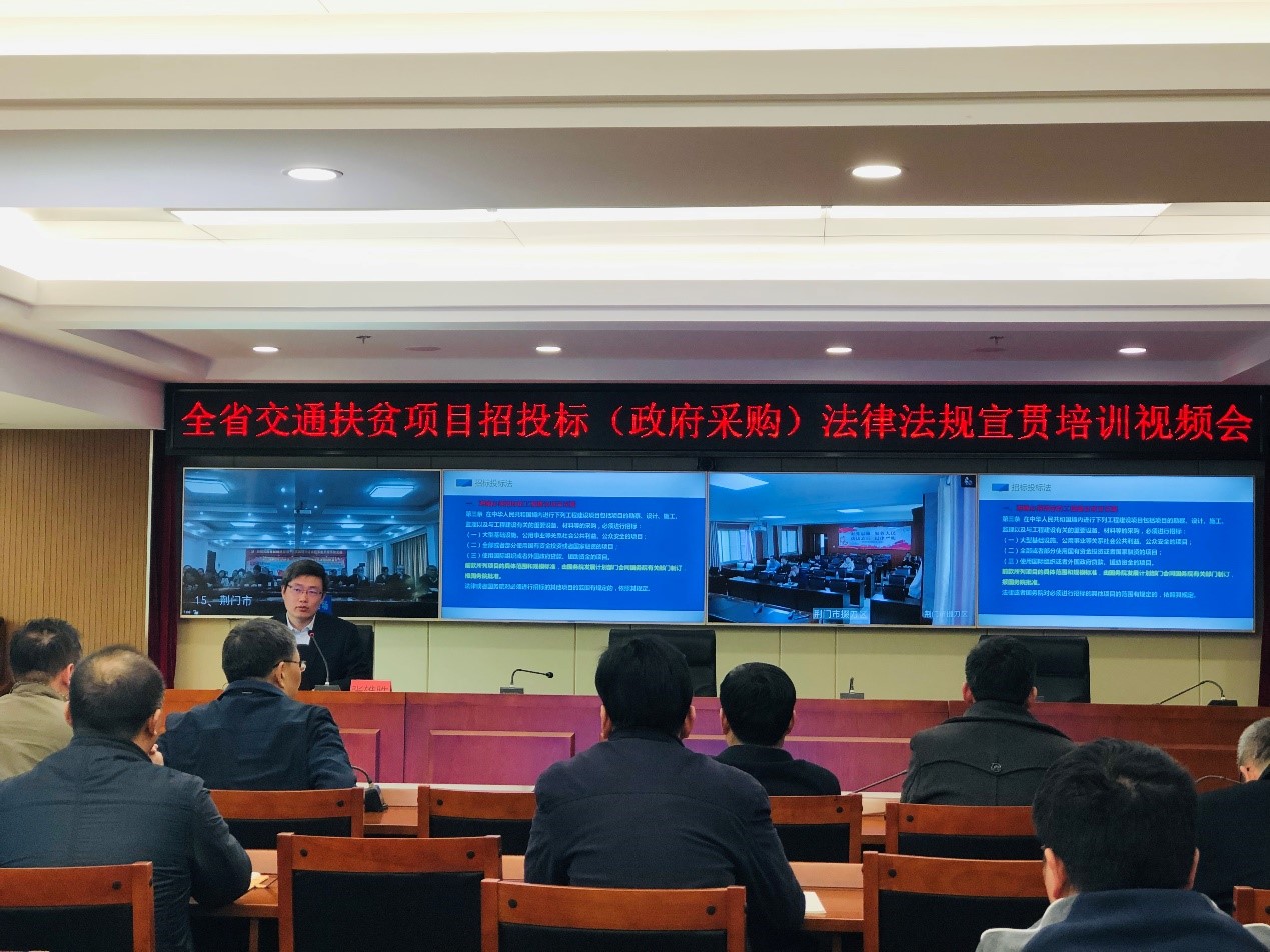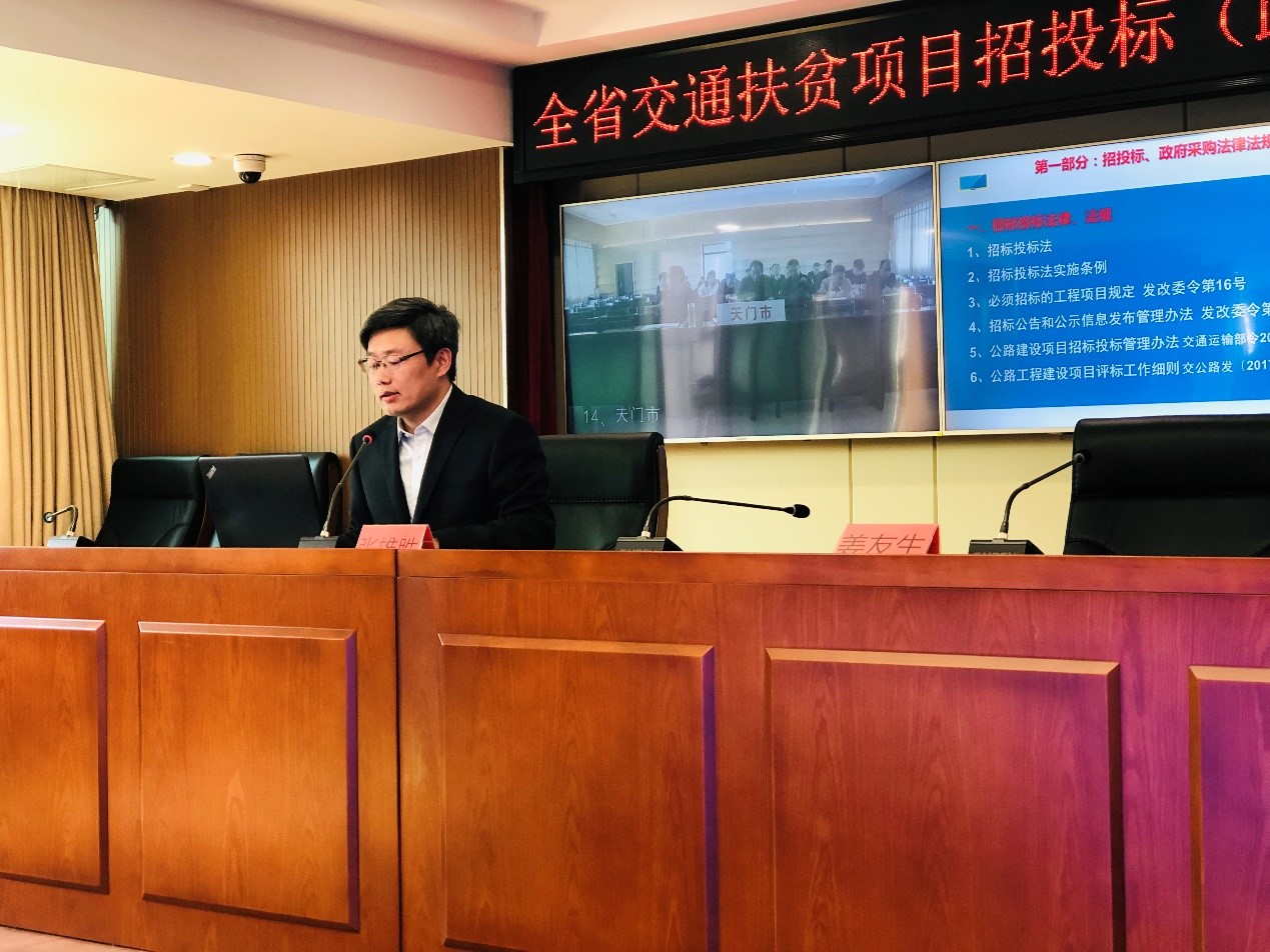 3月14日,湖北省交通运输厅在武汉组织开展了全省交通扶贫项目招标(政府采购)法律法规宣贯培训,旨在落实中央脱贫攻坚专项巡视整改要求,加强交通扶贫项目招投标管理。厅党组成员、副厅长姜友生主持会议,厅建设管理处陈飚处长和机关有关处室人员参加现场会,湖北省12个市(州)交通运输局、各县(市、区)交通运输局,省公路局、省港航局、省运管局、厅质监局、厅信息中心人员参加视频会议。华杰公司招标二部经理张雄胜受邀担任此次培训的主讲。